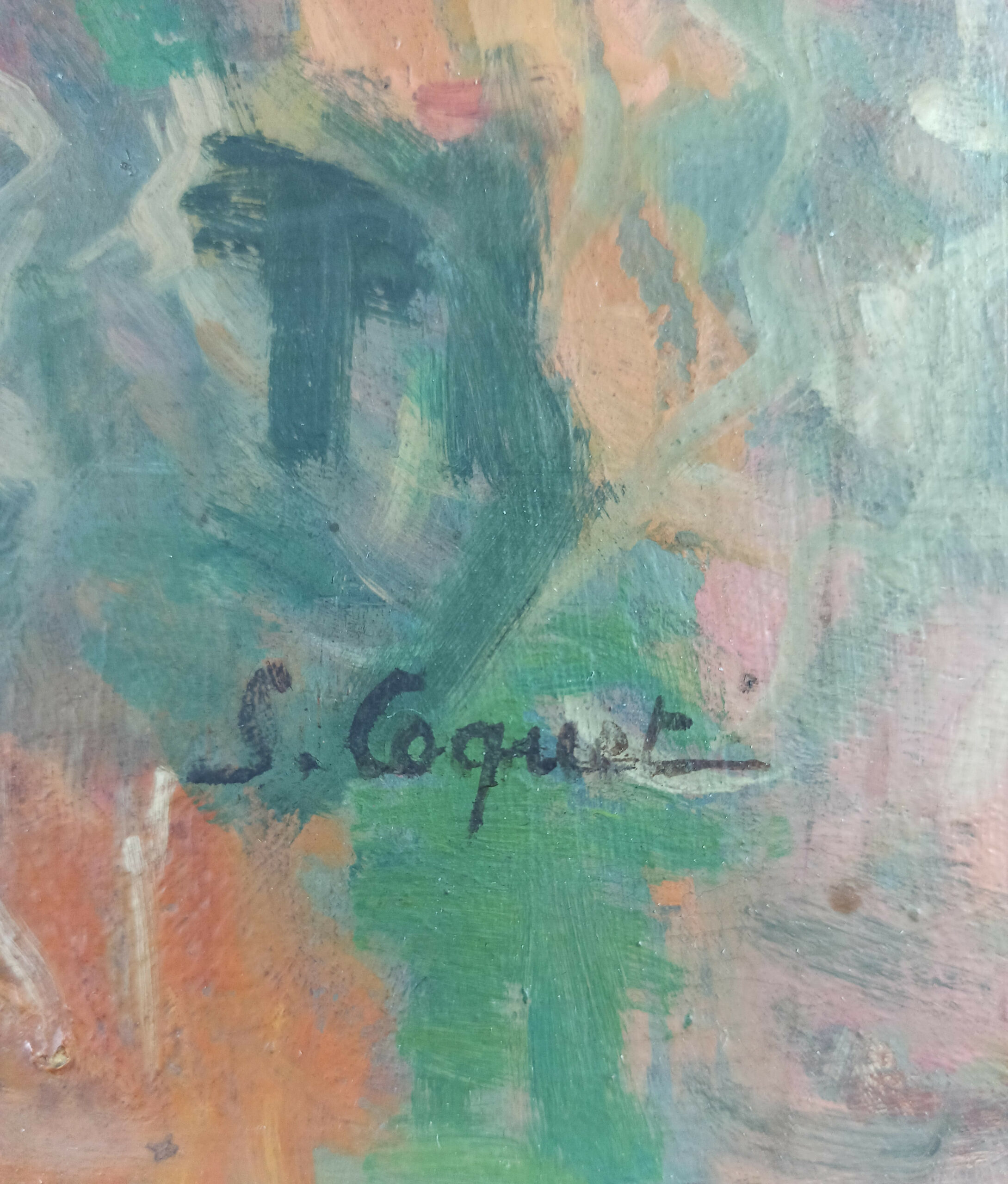 Oil on panel, signed lower right by the artist “S. Coquet”.